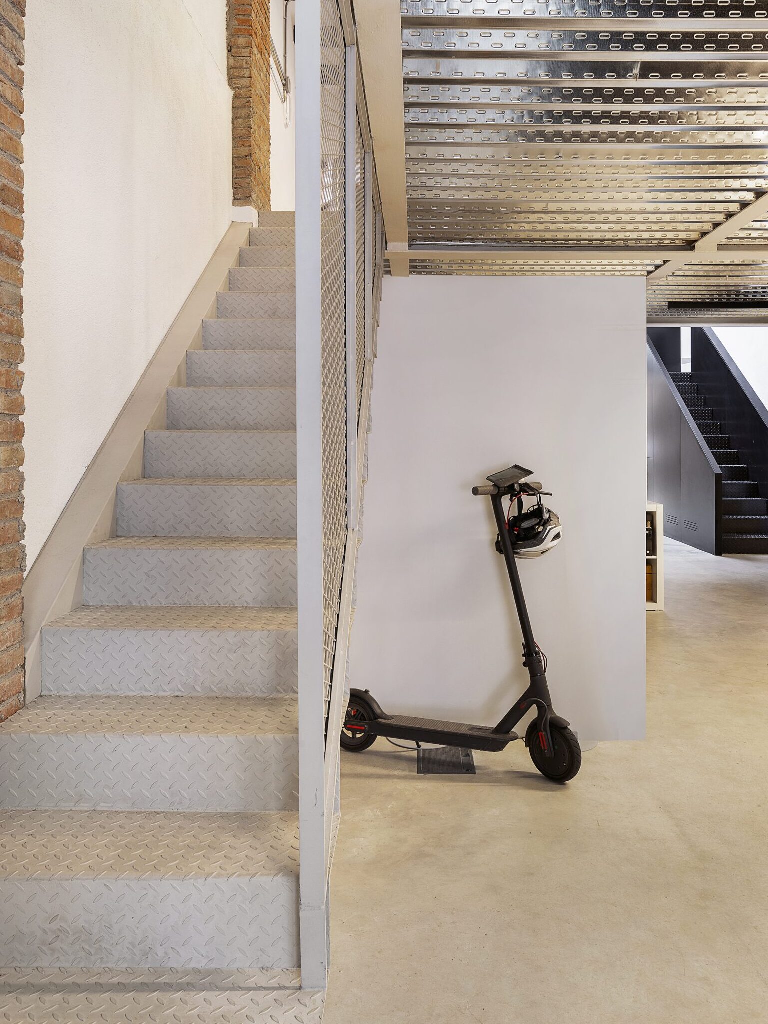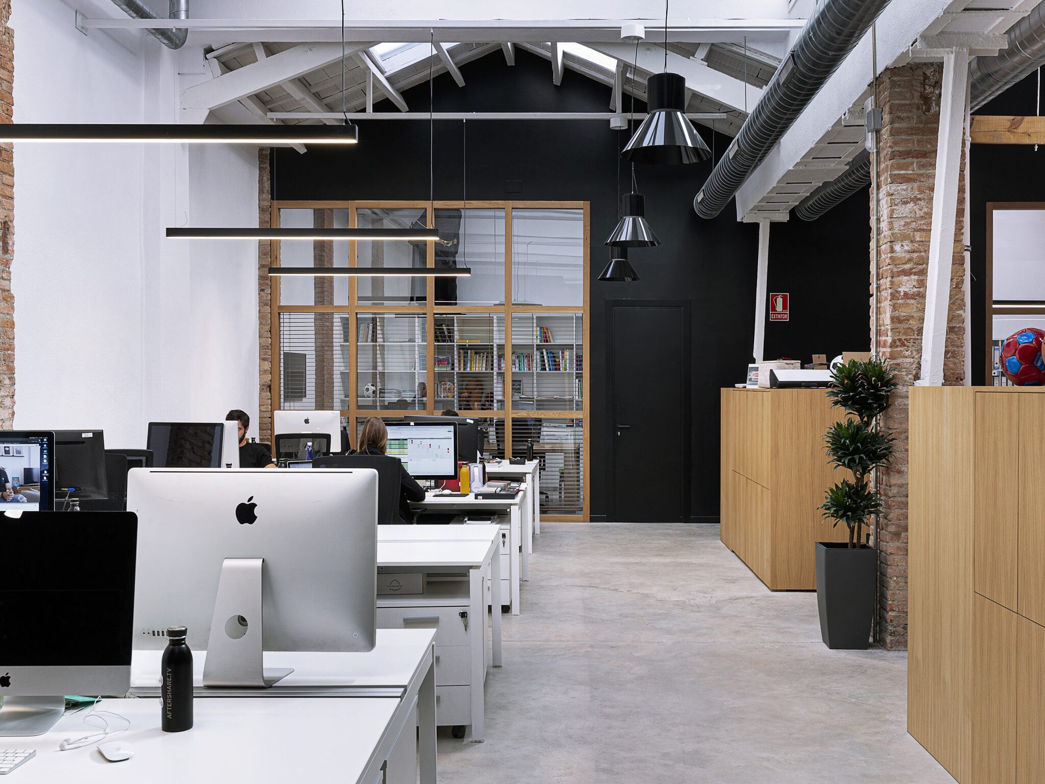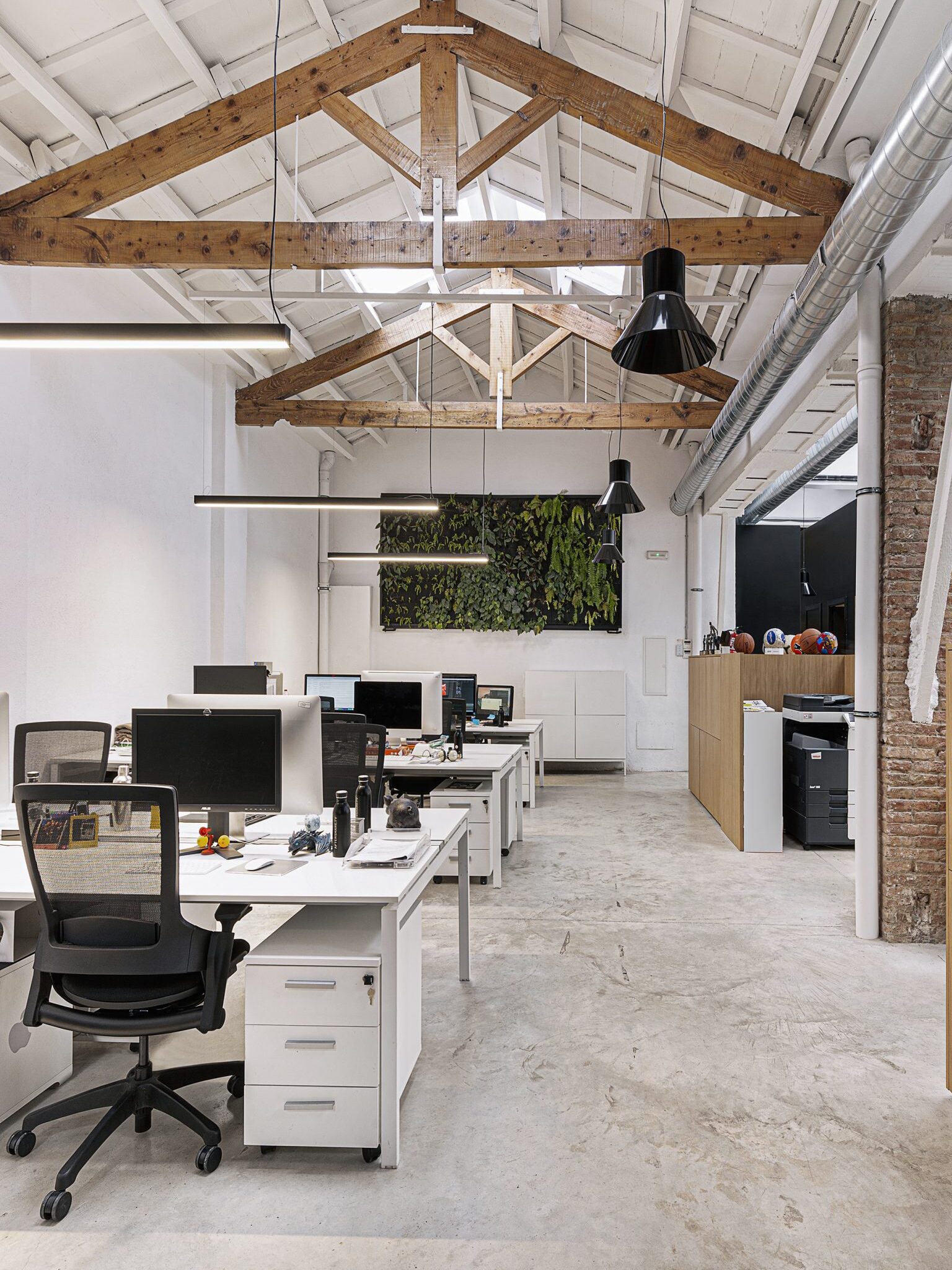 Rehabilitación estructural de una nave industrial destinada a oficinas en Barcelona. Se conserva la estructura existente de paredes y pilastras de fábrica maciza y la estructura principal de la cubierta de cerchas de madera.