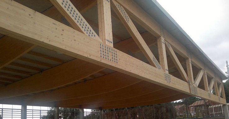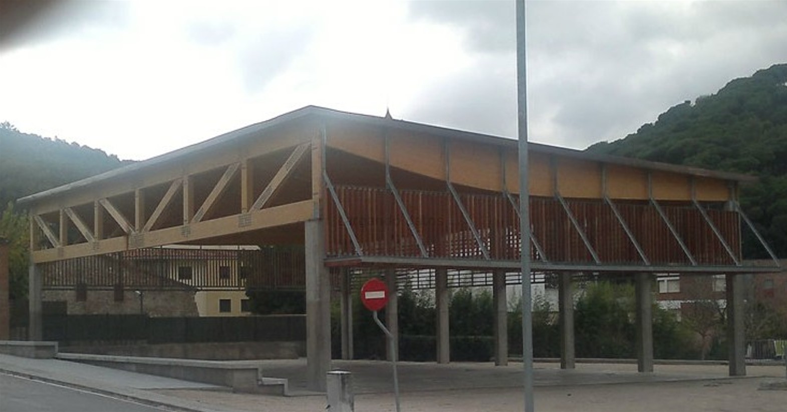 Càlcul d’estructura d’una pista poliesportiva coberta a Vallromanes Estructura amb pilars de formigó in-situ i coberta de fusta. Coberta de grans llums, jàsseres de 20 metres i encavallada de 30 metres que recull aquestes jàsseres.